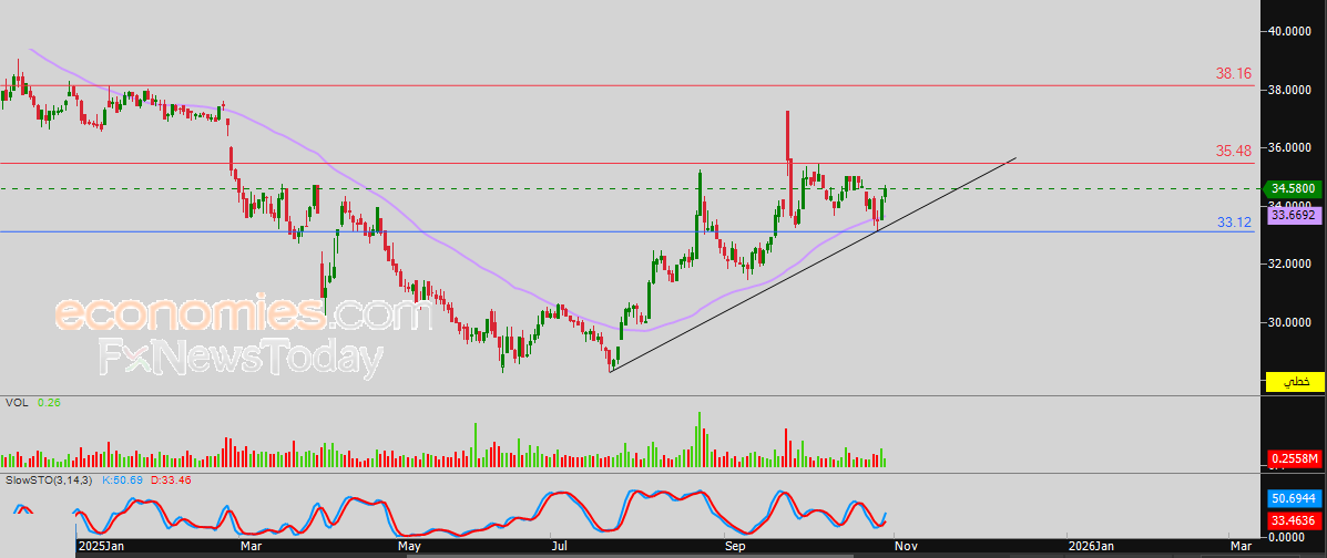 لهذا تشير توقعاتنا إلى صعود سعر السهم خلال تداولاته القادمة، طيلة ثبات مستوى الدعم 33.12 ريال، ليستهدف أولى مستويات المقاومة عند سعر 35.48 ريال.