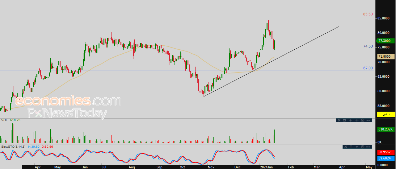 لذلك تشير توقعاتنا إلى المزيد من الصعود للسهم خلال تداولاته القادمة، طيلة ثبات الدعم 74.50، ليستهدف مستوى المقاومة المحوري 85.50 استعداداً لمهاجمته.