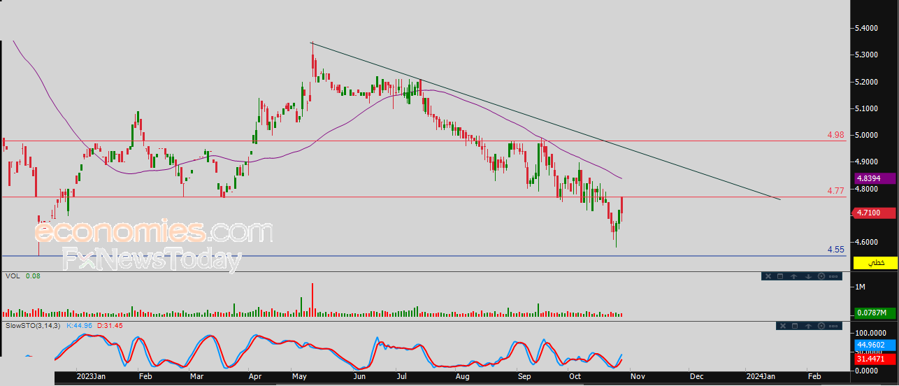 لهذا نحن نتوقع المزيد من الانخفاض للسهم خلال تداولاته القادمة، طيلة ثبات المقاومة 4.77، ليستهدف من جديد مستوى الدعم المحوري 4.55.