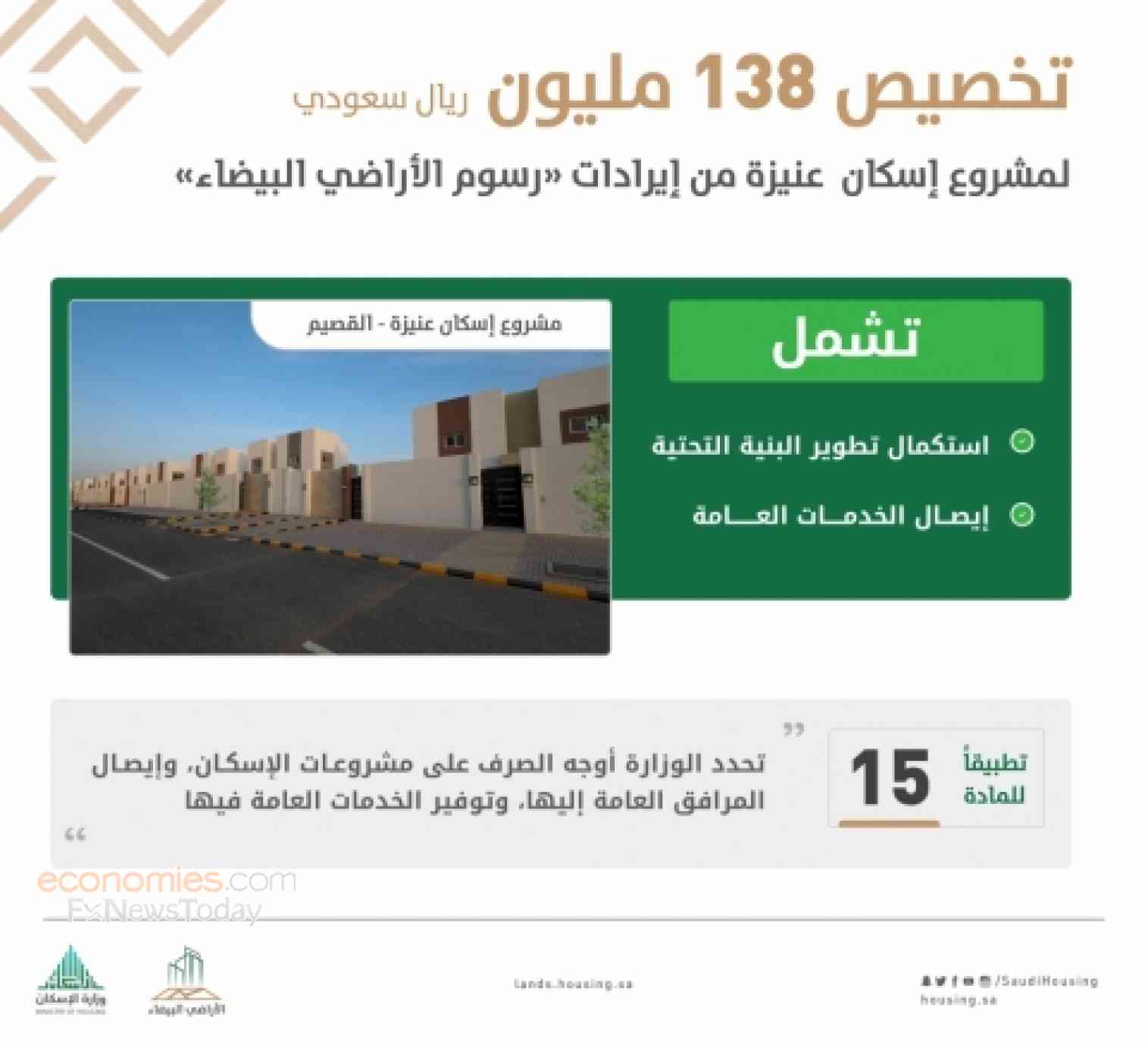 خصص برنامج رسوم الأراضي البيضاء التابع لوزارة الإسكان السعودية مبلغ 138 مليون ريال لاستكمال تنفيذ وإيصال خدمات البنية التحتية بمشروع "إسكان عنيزة" بمنطقة القصيم.