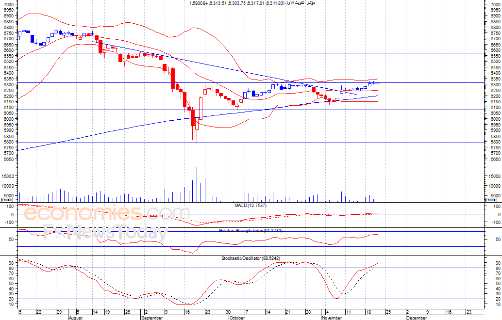 ارتفع المؤشر بشكل طفيف للغاية خلال جلسة الخميس الماضي، حيث أغلق عند مستوى 6313 نقطة، ملامسا لمستوى مقاومته الحالي عند 6320 نقطة، وهو المستوى الذي يجب على المؤشر تجاوزه لمواصلة ارتفاعه لمستوى مقاومته التالي عند 6550 نقطة.