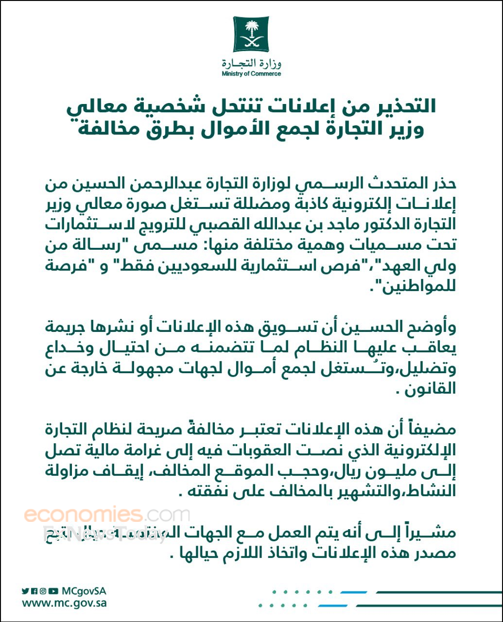 حذر المتحدث الرسمي لوزارة التجارة السعودية عبدالرحمن الحسين من إعلانات إلكترونية كاذبة ومضللة تستغل صورة معالي وزير التجارة الدكتور ماجد بن عبدالله القصبي، للترويج لاستثمارات تحت مسميات وهمية مختلفة، منها: مسمى "رسالة من ولي العهد"، "فرص استثمارية للسعوديين فقط" و"فرصة للمواطنين".