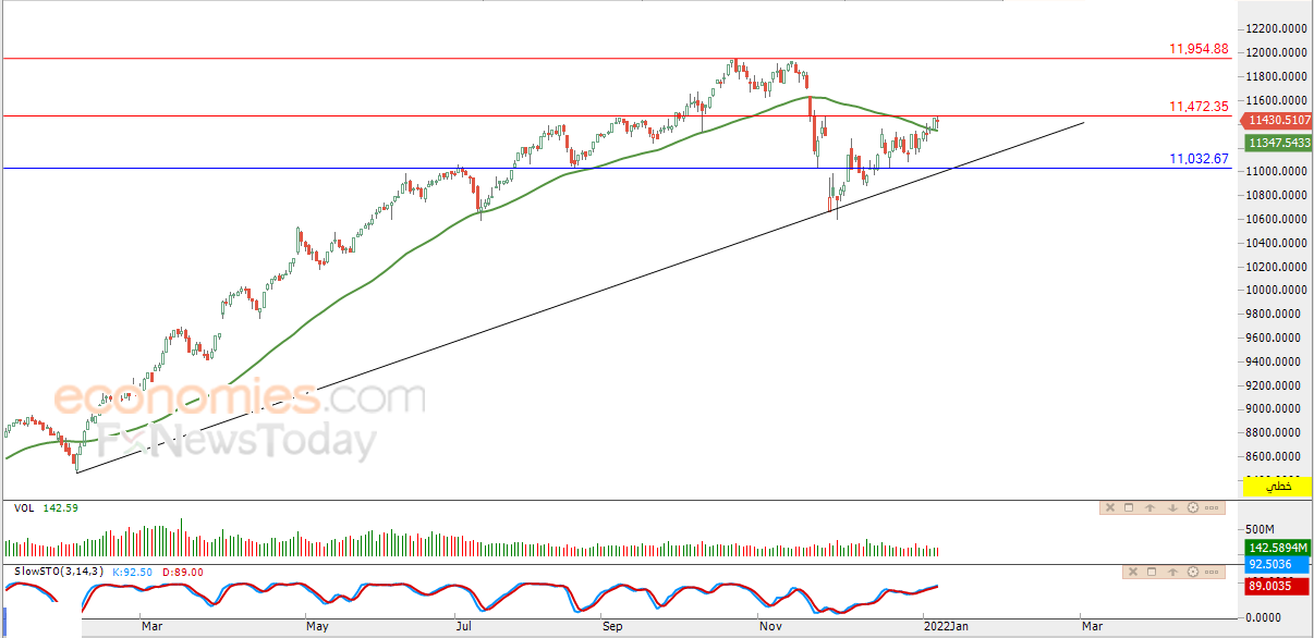 لذلك تشير توقعاتنا إلى ترجيح سيناريو ارتفاع المؤشر خلال تداولاته القادمة، خاصة في حالة اختراقه للمقاومة الحالية 11,472.35، ليستهدف بعدها مستوى المقاومة المحوري 11,954.88.