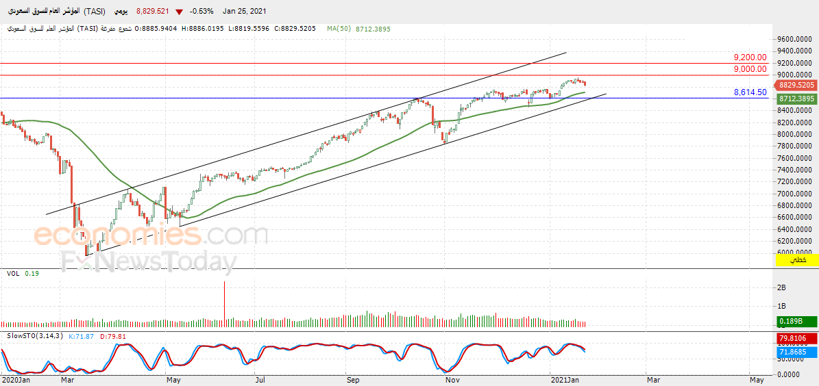 نطاق التداول المتوقع لهذا اليوم ما بين مستوى الدعم 8,747.09 ومستوى المقاومة 9,000.00.