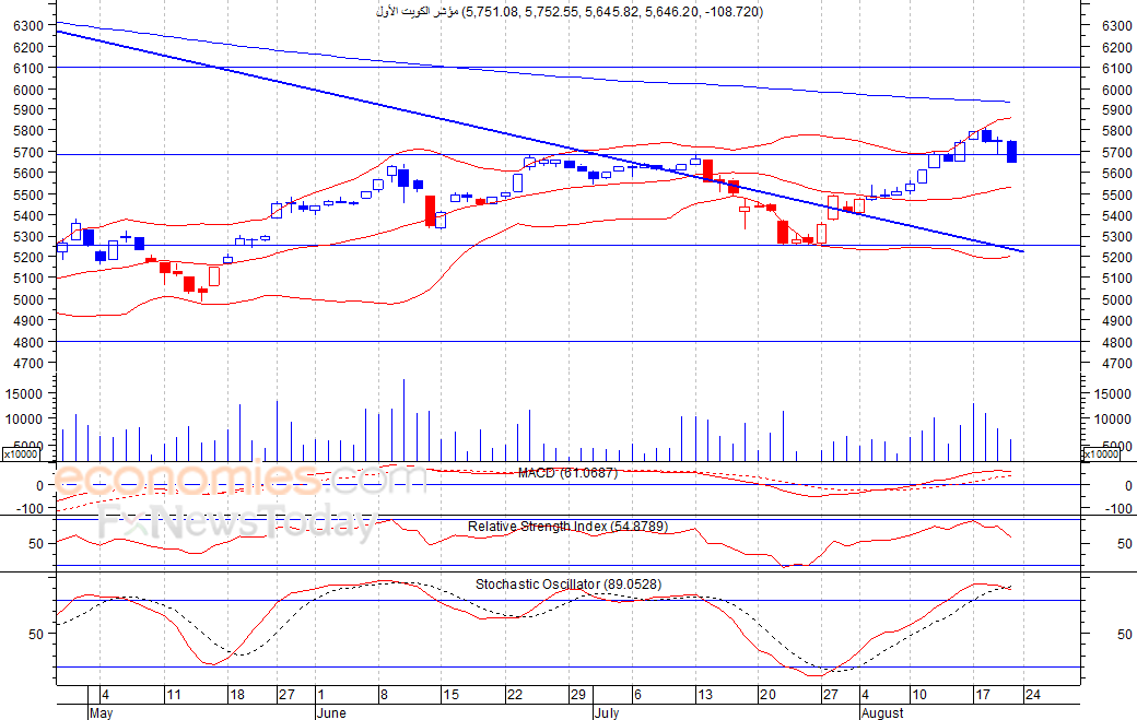انخفض المؤشر لينهي تداولات امس الأحد اولى جلسات الأسبوع الحالي عند مستوى 5646 نقطة، مخترقا بذلك مستوى الدعم السابق عند 5700 نقطة، مما نتوقع معه عمليات جني أرباح قد تهبط به لمستوى الدعم 5250 نقطة كمستوى اول، شرط بقاء المؤشر اسفل مستوى 5850 نقطة.