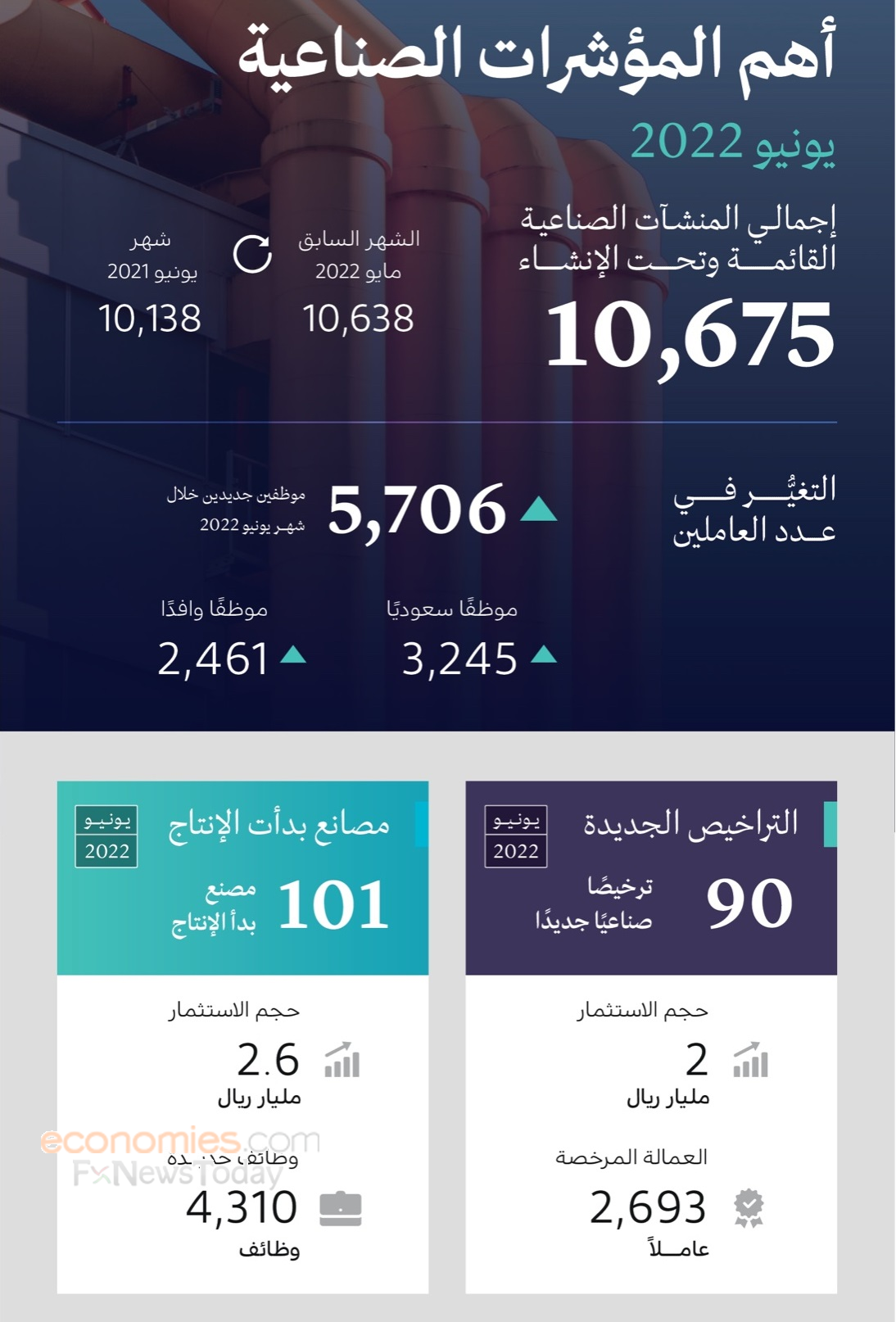 وأفاد تقرير المركز أن المصانع التي بدأت الإنتاج خلال شهر يونيو الماضي بلغت 101 بحجم استثمارات يبلغ 2.6 مليار ريال، تتصدرها مصانع المعادن اللافلزية بـ21 مصنعًا، ثم المصانع الغذائية بـ 17 مصنعًا، في حين جاءت مصانع المطاط واللدائن بـ 14 مصنعًا، تليها مصانع المواد الكيميائية بـ 12 مصنعًا، وأخيرًا مصانع المعادن المشكلة بـ 10 مصانع، فيما استحوذت المصانع الوطنية على إجمالي المصانع التي بدأت الإنتاج خلال شهر (يونيو) الماضي بنسبة 93.07%، تليها المصانع الأجنبية بنسبة 3.96%، ثم المصانع ذات الاستثمار المشترك بنسبة 2.97%.