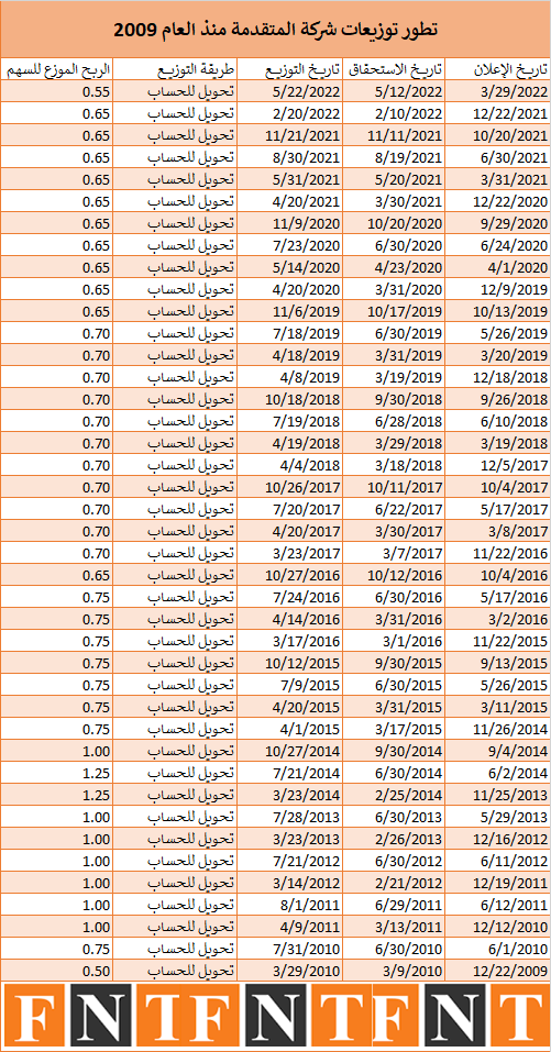 وأعلنت الشركة المتقدمة للبتروكيماويات، في شهر ديسمبر الماضي، عن توزيع أرباح نقدية على المساهمين عن الربع الرابع من العام 2021م، بقيمة 140.7 مليون ريال، بواقع 0.65 ريال للسهم، وهي نفس قيمة توزيعات الشركة على مدار 5 أرباع سابقة.