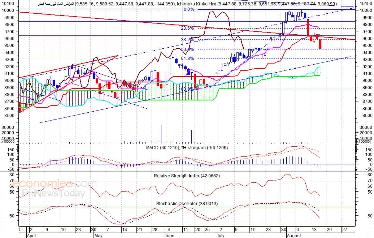 انخفض المؤشر بقوة في اخر جلسات الأسبوع قبل الماضي، حيث اغلق عند مستوى 9447 نقطة، وهو ادنى مستوى يصل اليه المؤشر خلال الجلسة، في ظل استمرار الإشارات السلبية على المؤشرات الفنية مثل مؤشر استوكاستيك، مما يشير الى تواجد القوى البيعية والتي قد تضغط على المؤشر لدفعه لأسفل لمستوى الدعم 9300 نقطة، والذي يقابل ما نسبته 61.8% من مستويات التصحيح لفيبوناتشي لاخر حركة صاعدة خلال الفترة من يونيو حتى أغسطس الحالي، شرط ثبات المؤشر أسفل مستوى 9650 نقطة.