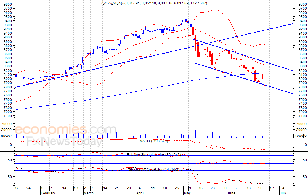 ارتفع المؤشر بشكل طفيف نهاية تداولات الخميس الماضي، حيث اغلق عند مستوى 8017 فلس، في ظل تدني كميات التداول، كما يتداول المؤشر حاليا في قناة هابطة على المدى القصير، لذلك نتوقع ان يعاود المؤشر التراجع للوصول لمستوى الدعم 7700 نقطة كمستوى اول مرة اخرى، شرط بقاء المؤشر اسفل مستوى 8100 نقطة.