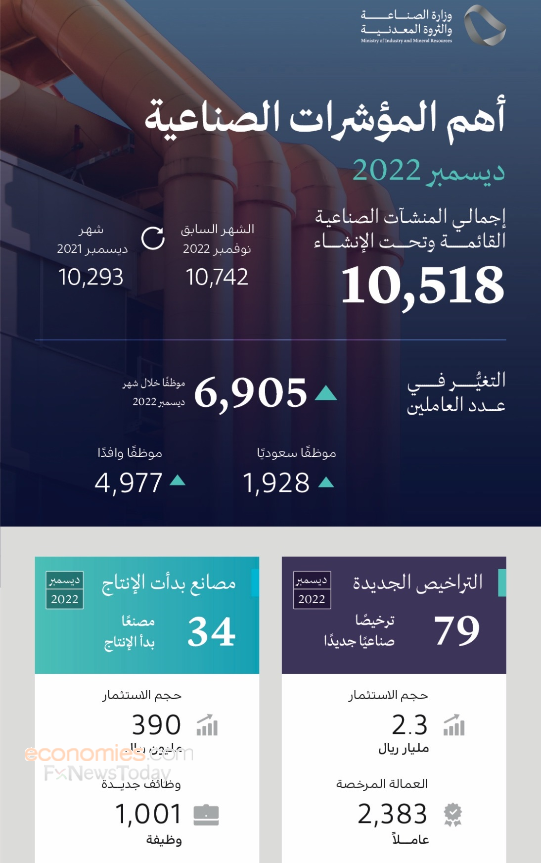 أصدرت وزارة الصناعة والثروة المعدنية السعودية 79 ترخيصاً صناعياً جديداً، خلال شهر ديسمبر 2022، توزعت على ستة أنشطة صناعية، تصدرها نشاط صنع المعادن المشكلة باستثناء الآلات والمعدات بـ13 ترخيصاً، تلاه نشاط صنع المنتجات الغذائية بـ 11 ترخيصاً، ونشاط صنع الأثاث بـ 9 تراخيص، ونشاط صنع منتجات المعادن اللافلزية الأخرى بـ 8 تراخيص، ونشاط صنع المواد الكيميائية والمنتجات الكيميائية، ونشاط صنع منتجات المطاط واللدائن بـ 7 تراخيص لكل فئة منها.