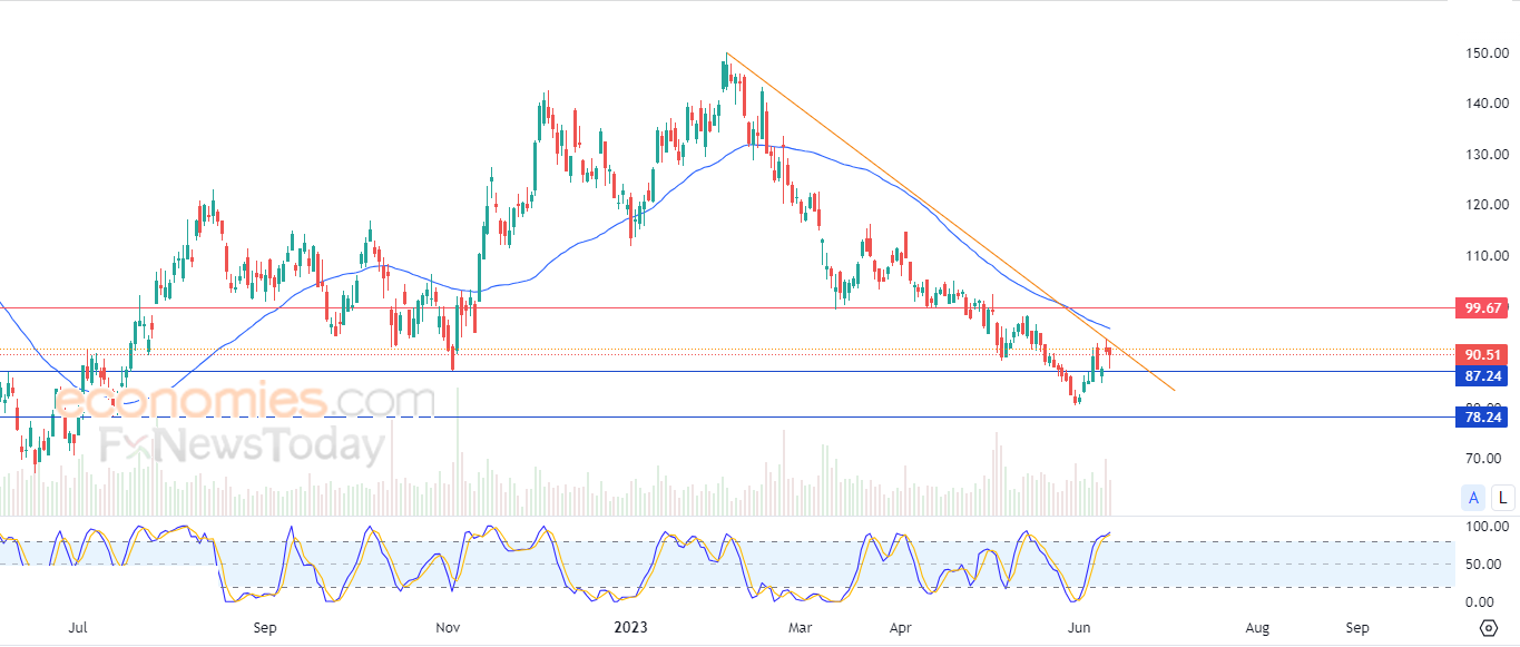 لذلك نحن نتوقع المزيد من الانخفاض للسهم خلال تداولاته القادمة، طيلة ثبات المقاومة 99.70، ليستهدف مستوى الدعم 78.25.