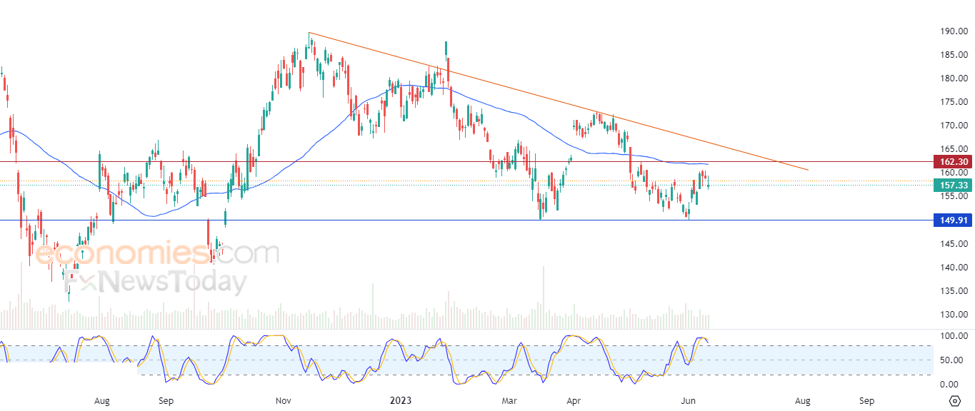 لذلك تشير توقعاتنا إلى المزيد من الانخفاض للسهم خلال تداولاته القادمة، طيلة استقراره دون مستوى المقاومة 162.30، ليستهدف مستوى الدعم المحوري 149.90.