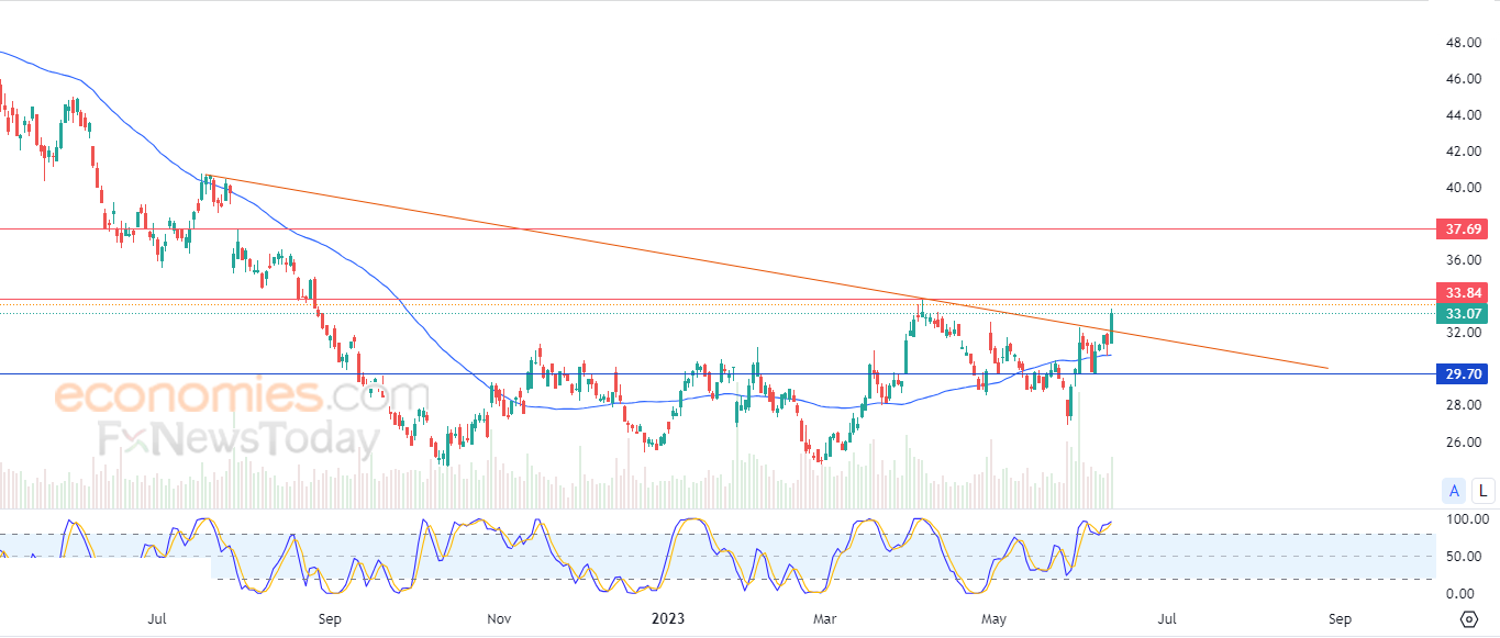 لذلك نحن نتوقع المزيد من الصعود للسهم خلال تداولاته القادمة، خاصة في حالة اختراقه للمقاومة 33.85، ليستهدف بعدها أولى مستويات المقاومة عند 37.70.