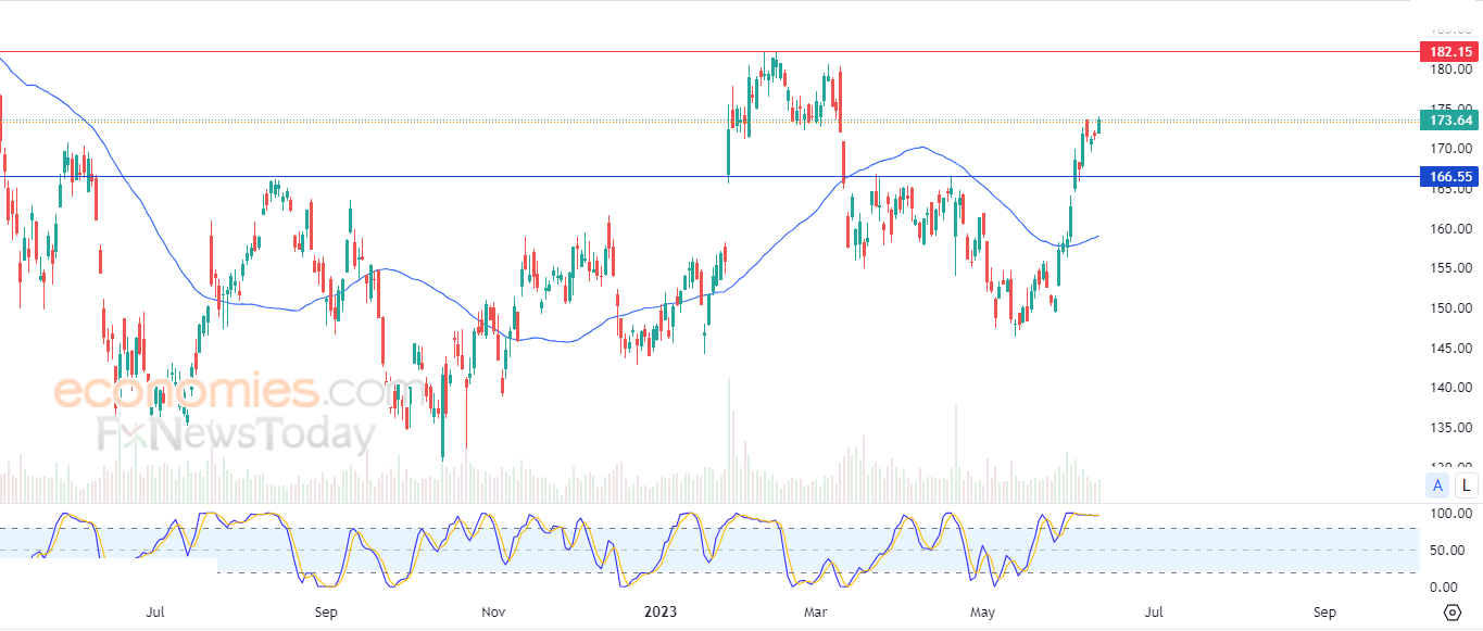لهذا تشير توقعاتنا إلى المزيد من الصعود للسهم خلال تداولاته القادمة، طيلة ثبات الدعم 166.55، ليستهدف مستوى المقاومة المحوري 182.15.