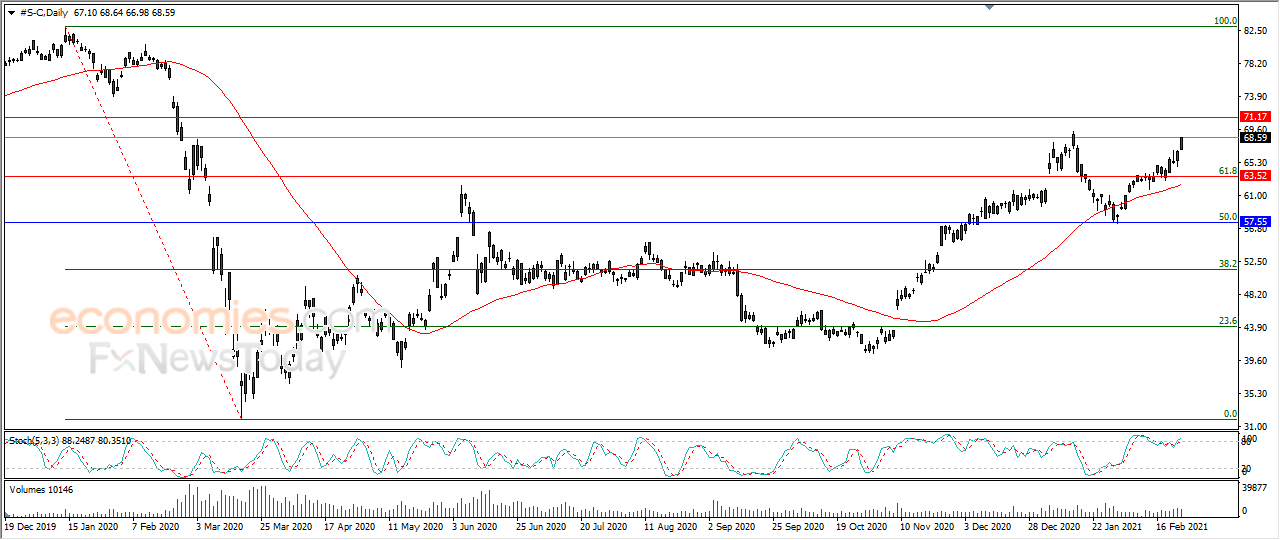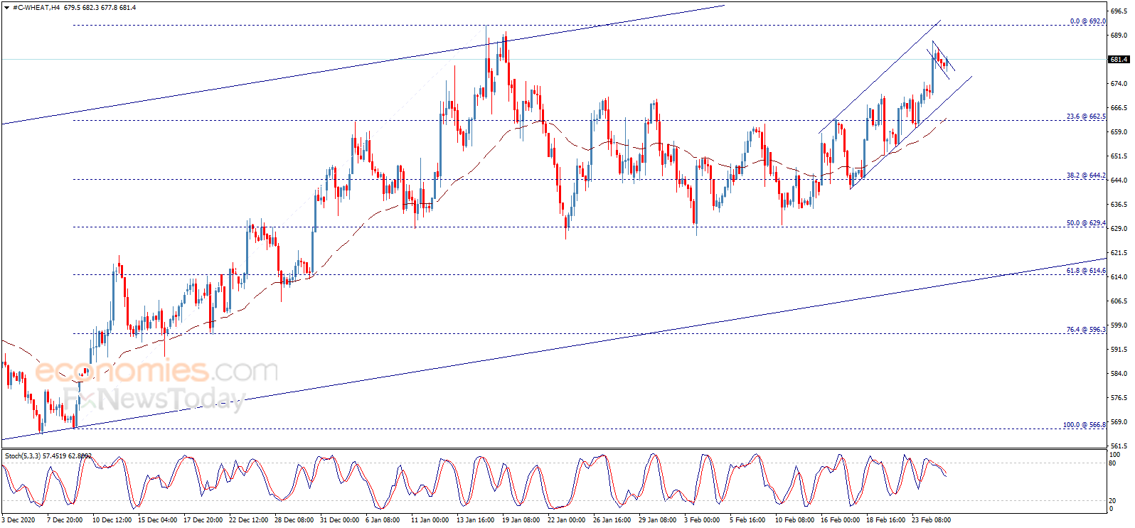 يظهر سعر القمح تداولات إيجابية جديدة ليبدأ عملية اختراق مقاومة العلم الاستمراري الصاعد الذي تظهر ملامحه بالرسم البياني أعلاه، معززاً التوقعات باستمرار الاتجاه الرئيسي الصاعد، والذي يستهدف مستوى 692.00 كمحطة تالية، مع التذكير بأهمية الثبات فوق 670.00 لتحقيق الأهداف المنتظرة.