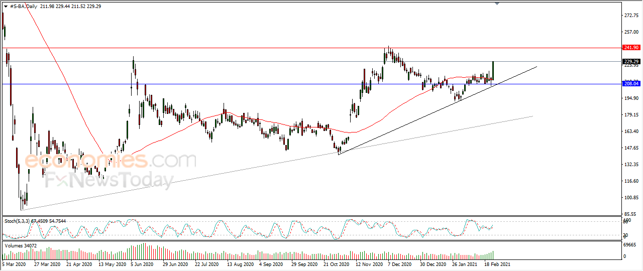 قفز سهم شركة بوينج (BA) ارتفاعاً في آخر جلساته، وذلك على إثر استناد السهم لدعم متوسطه المتحرك البسيط لفترة 50 يوماً السابقة، ما ساعده على اكتساب زخماً إيجابياً ليحقق مكاسب حادة بلغت نسبتها 8.12% بما يعادل 17.22 نقطة ليستقر على سعر 229.34 دولار، وسط بدء توارد الإشارات الإيجابية من جديد بمؤشرات القوة النسبية، وتحت سيطرة الاتجاه الصاعد على المدى المتوسط والقصير.