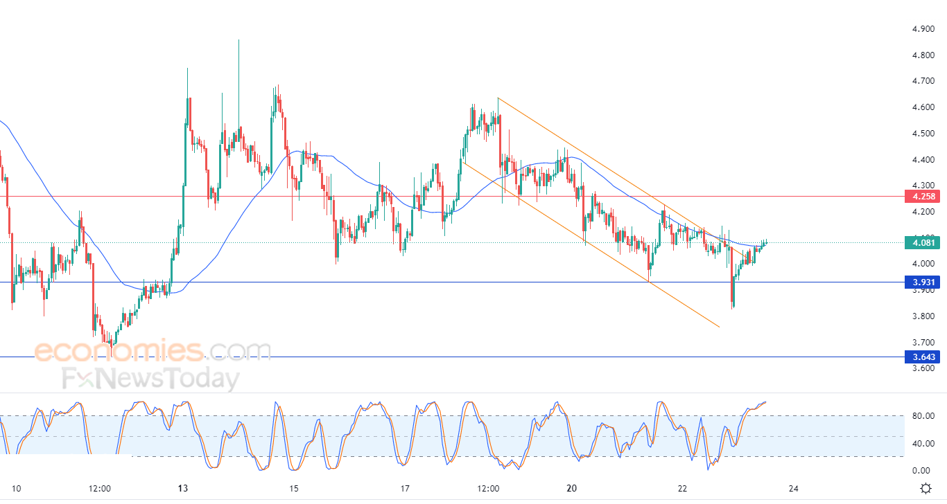 لذلك تشير توقعاتنا إلى ارتفاع الزوج خلال تداولاته القادمة، طيلة ثبات الدعم 3.931، ليستهدف أولى مستويات المقاومة عند 4.258.