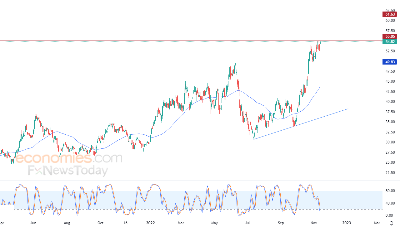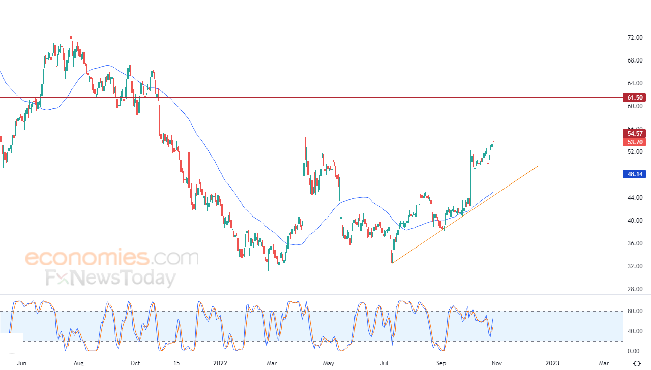 لهذا نحن نتوقع المزيد من الارتفاع للسهم خلال تداولاته القادمة، خاصة في حالة اختراقه للمقاومة 55.00، ليستهدف بعدها مستوى المقاومة 61.60.