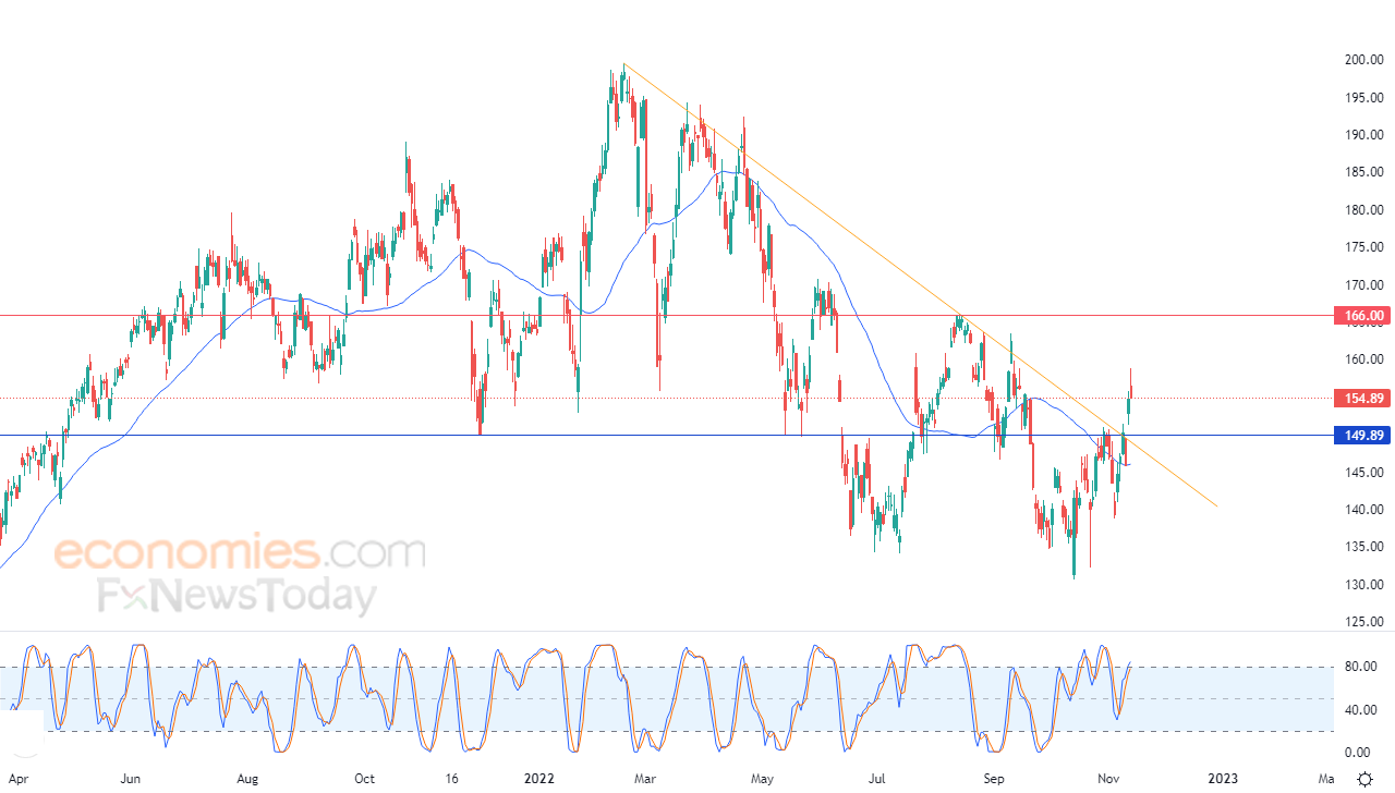 لذلك تشير توقعاتنا إلى المزيد من الارتفاع للسهم خلال تداولاته القادمة، طيلة ثبات الدعم 149.90، ليستهدف أولى مستويات المقاومة عند 166.00.