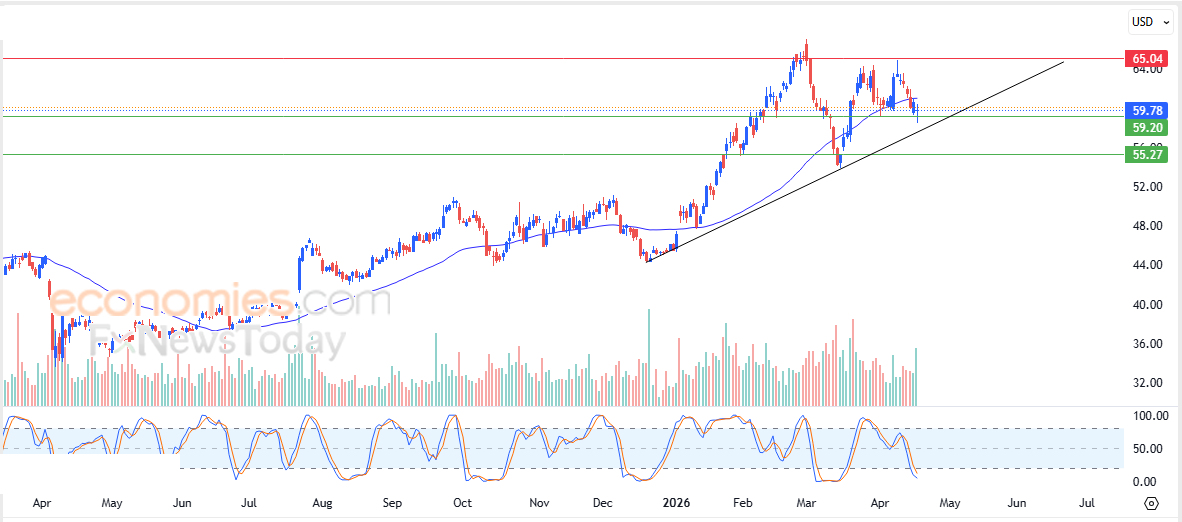 لهذا فطيلة ثبات مستوى الدعم 59.00$ فإن توقعاتنا تميل نحو صعود سعر السهم خلال تداولاته القادمة، ليستهدف مستوى المقاومة المحوري 65.00$.