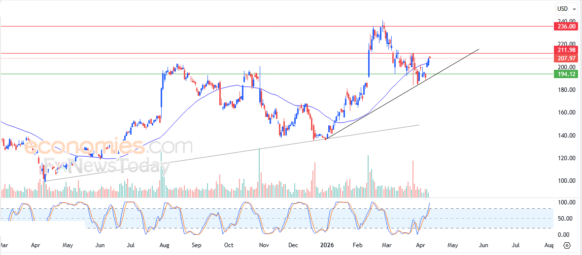 لهذا فتوقعاتنا تشير إلى صعود سعر السهم خلال تداولاته القادمة، خاصة في حالة اختراقه للمقاومة 212.00$، ليستهدف بعدها مقاومته المحورية 236.00$.