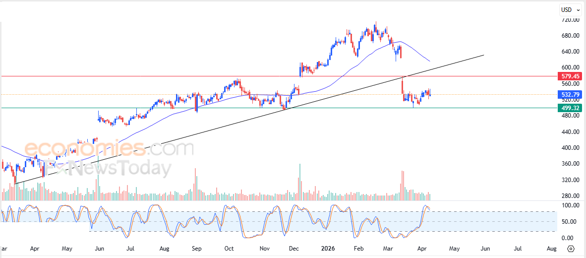 لهذا فتوقعاتنا تشير إلى هبوط سعر السهم خلال تداولاته القادمة، طيلة ثبات مستوى المقاومة 579.45$، ليستهدف مستوى الدعم المحوري 499.35$.