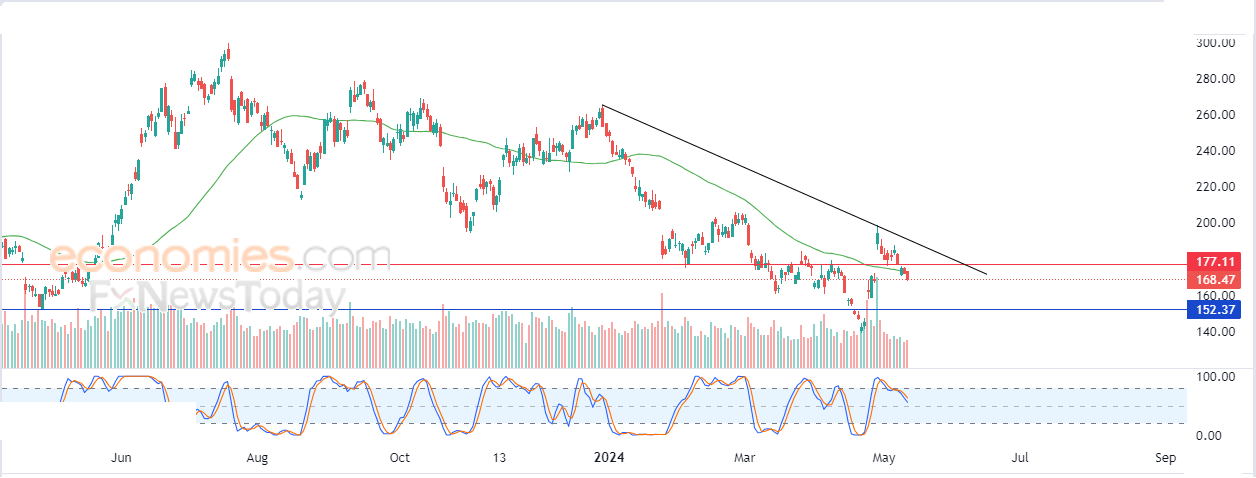 لهذا تشير توقعاتنا إلى المزيد من الانخفاض لسعر السهم خلال تداولاته القادمة، طيلة استقراره دون مستوى المقاومة 177.00$، ليستهدف مستوى الدعم المحوري 152.37$.