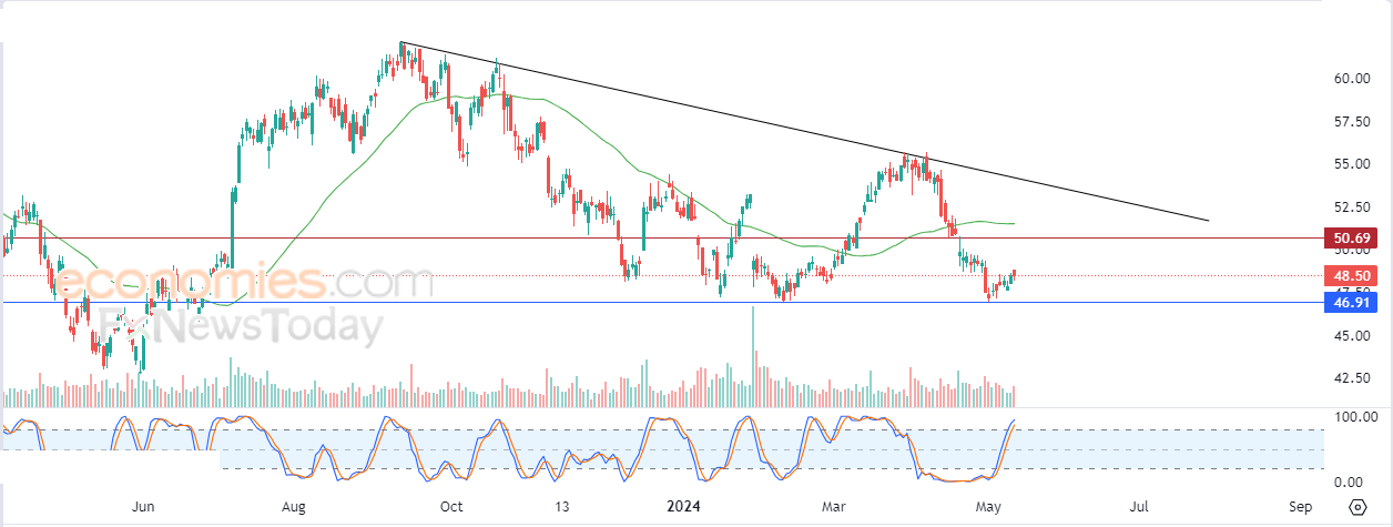 لهذا تشير توقعاتنا إلى ترجيح سيناريو عودة هبوط سعر السهم خلال تداولاته القادمة، طيلة ثبات المقاومة 50.70$، ليستهدف مستوى الدعم المهم 46.90$.