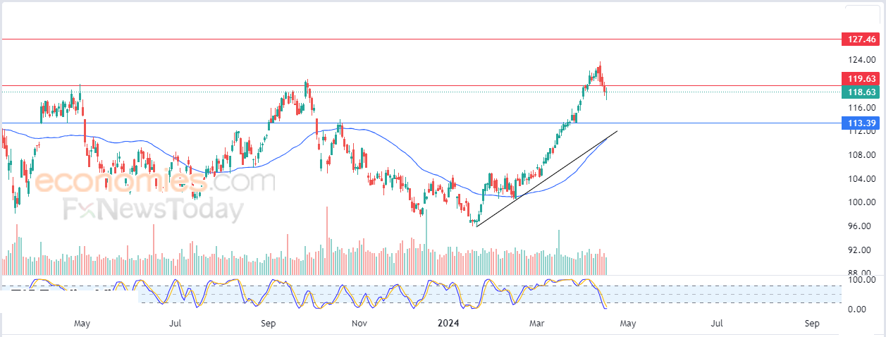 نرجح عودة صعود سعر السهم خلال تداولاته القادمة، بشرط اختراقه أولاً لمستوى المقاومة المحوري 119.63$، ليستهدف بعدها مستوى المقاومة 127.50$.
