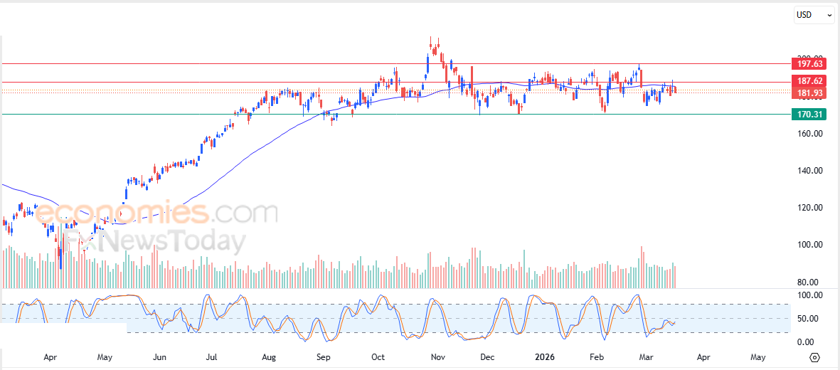 لهذا تشير توقعاتنا إلى انخفاض سعر السهم خلال تداولاته القادمة، طيلة ثبات مستوى المقاومة 187.65$، ليستهدف مستوى الدعم المحوري 170.30$.