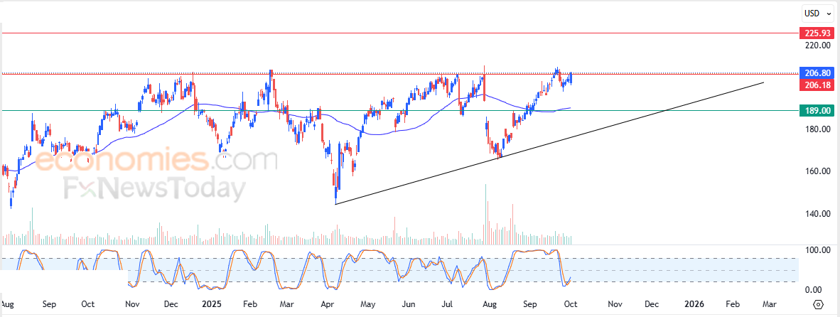 لذلك فتوقعاتنا تشير إلى صعود سعر السهم خلال تداولاته القادمة، بشرط اختراقه أولاً للمقاومة المذكورة 206.18$، ليستهدف بعدها مقاومته التالية عند سعر 225.90$.