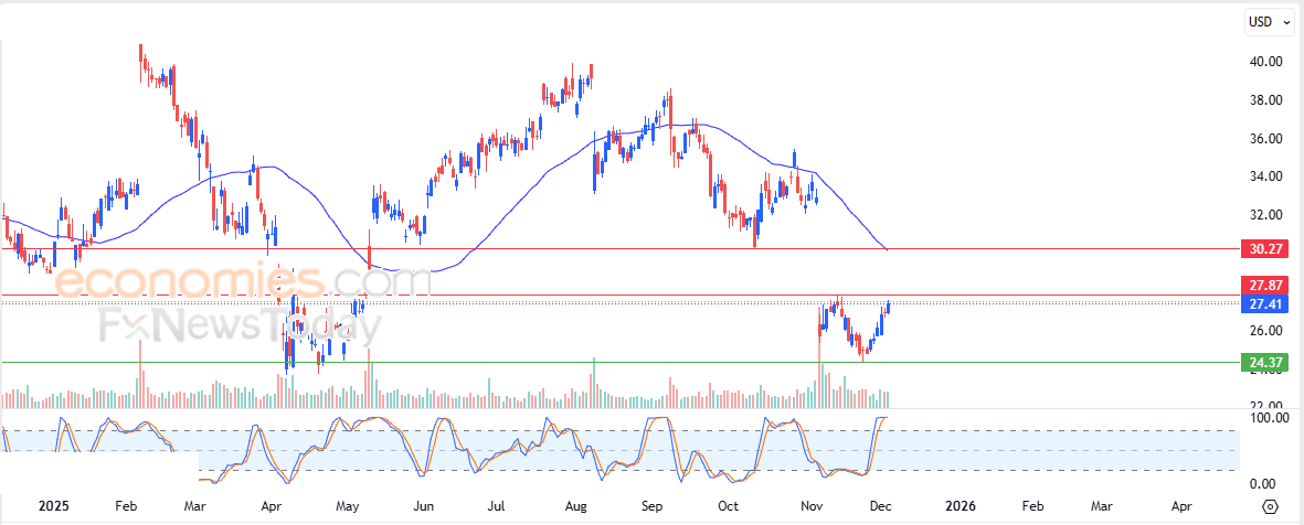 لذلك فتوقعاتنا تميل نحو هبوط سعر السهم خلال تداولاته القادمة، خاصة طيلة ثبات مستوى المقاومة 27.85$، ليستهدف مستوى الدعم المحوري 24.40$.