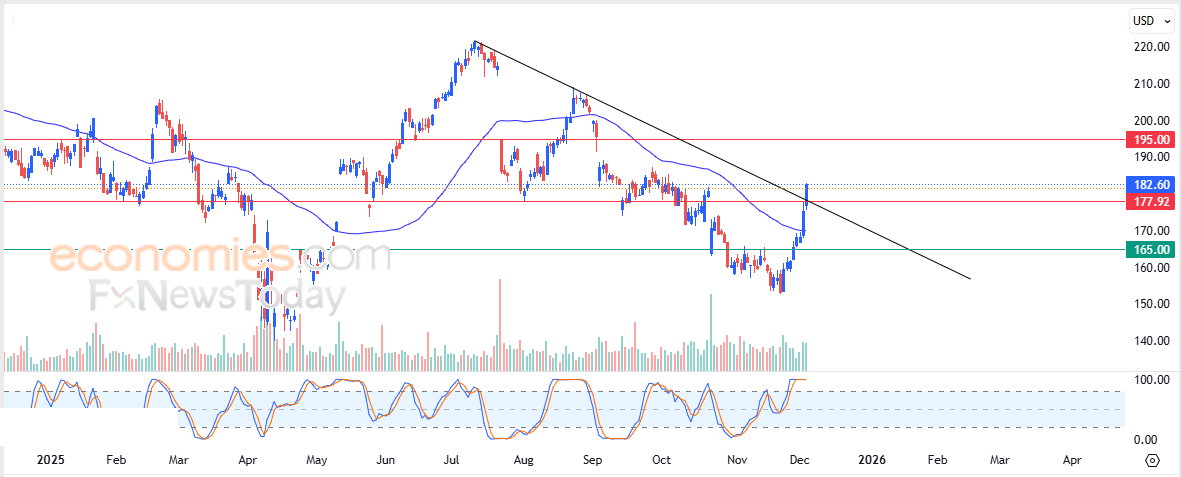 لهذا فتوقعاتنا تشير إلى صعود سعر السهم خلال تداولاته القادمة، خاصة طيلة استقراره أعلى سعر 177.90$، ليستهدف مقاومته التالية عند سعر 195.00$.