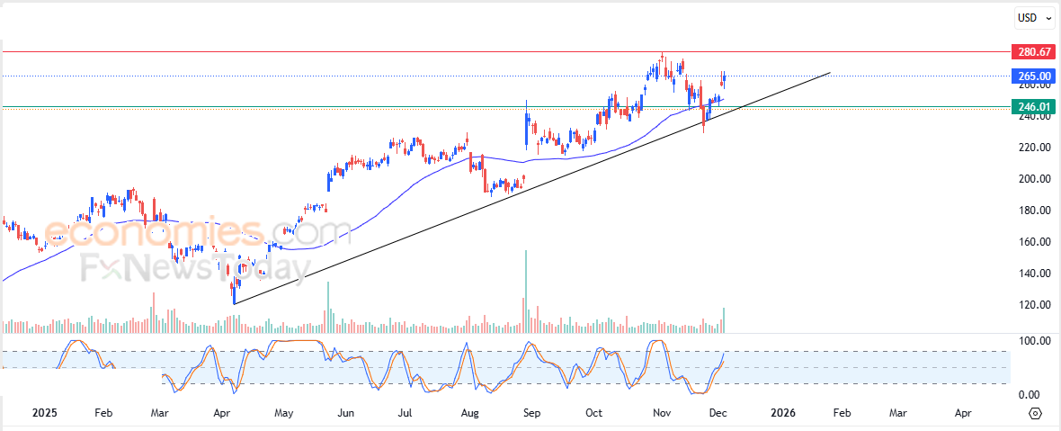 لهذا فتوقعاتنا تشير إلى صعود سعر السهم خلال تداولاته القادمة، طيلة استقراره أعلى الدعم 246.00$، ليستهدف مستوى المقاومة المحوري 280.65$.