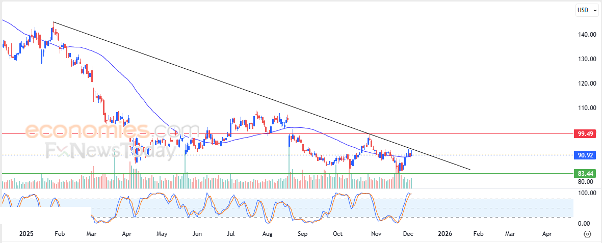 لهذا تشير توقعاتنا إلى هبوط سعر السهم خلال تداولاته القادمة، طيلة ثبات مستوى المقاومة 99.50$، ليستهدف مستوى الدعم 83.45$.