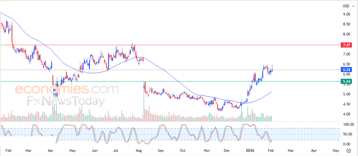 لهذا تشير توقعاتنا إلى صعود سعر السهم خلال تداولاته القادمة، طيلة ثبات مستوى الدعم 5.64$، ليستهدف مستوى المقاومة المحوري 7.47$.