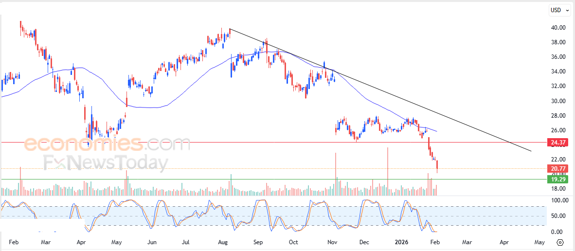 لهذا تشير توقعاتنا إلى انخفاض سعر السهم خلال تداولاته القادمة، طيلة ثبات مستوى المقاومة 24.35$، ليستهدف مستوى الدعم التالي له عند سعر 19.30$.