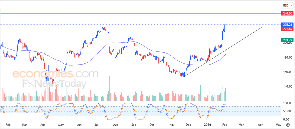 لذلك تشير توقعاتنا إلى صعود سعر السهم خلال تداولاته القادمة، خاصة طيلة استقراره أعلى المقاومة المذكورة 221.70$، ليستهدف مقاومته التالية عند سعر 240.50$.