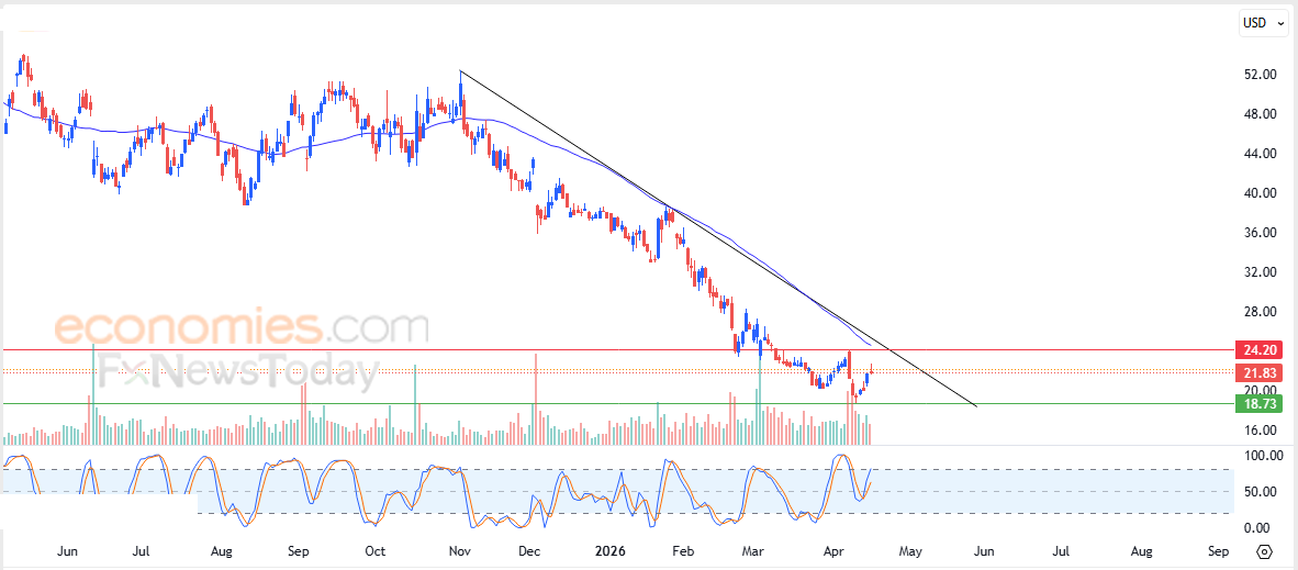 لهذا تشير توقعاتنا إلى انخفاض سعر السهم خلال تداولاته القادمة، طيلة ثبات مستوى المقاومة 24.20$، ليستهدف من جديد مستوى الدعم 18.75$.