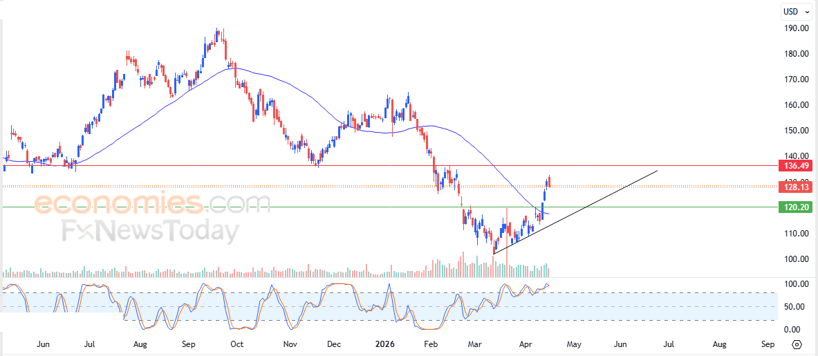 لهذا تشير توقعاتنا إلى صعود سعر السهم خلال تداولاته القادمة، طيلة ثبات مستوى الدعم 120.20$، ليستهدف مستوى المقاومة المحوري 136.50$.