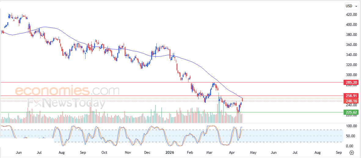 لذلك تشير توقعاتنا إلى انخفاض سعر السهم خلال تداولاته القادمة، طيلة ثبات مستوى المقاومة 258.90$، ليستهدف مستوى الدعم 225.65$.