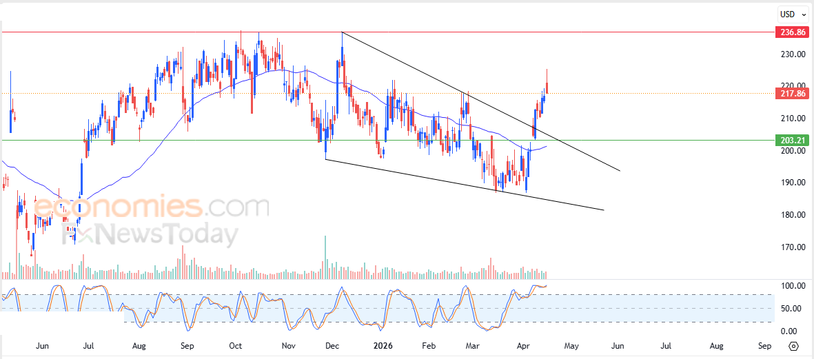 لهذا فتوقعاتنا تشير إلى صعود سعر السهم خلال تداولاته القادمة، طيلة ثبات مستوى الدعم 203.20$، ليستهدف مستوى المقاومة المحوري 236.85$.