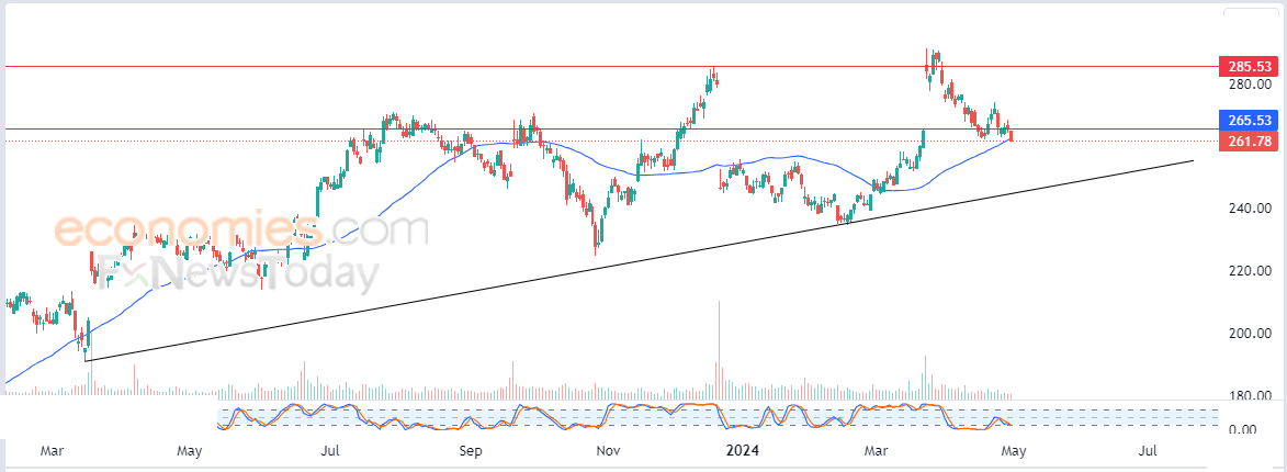 لذلك نحن نرجح عودة صعود سعر السهم خلال تداولاته القادمة، ولكن بشرط عليه أولاً الاستقرار من جديد فوق مستوى 265.50$، ليستهدف بعدها مستوى المقاومة المحوري 285.50$.