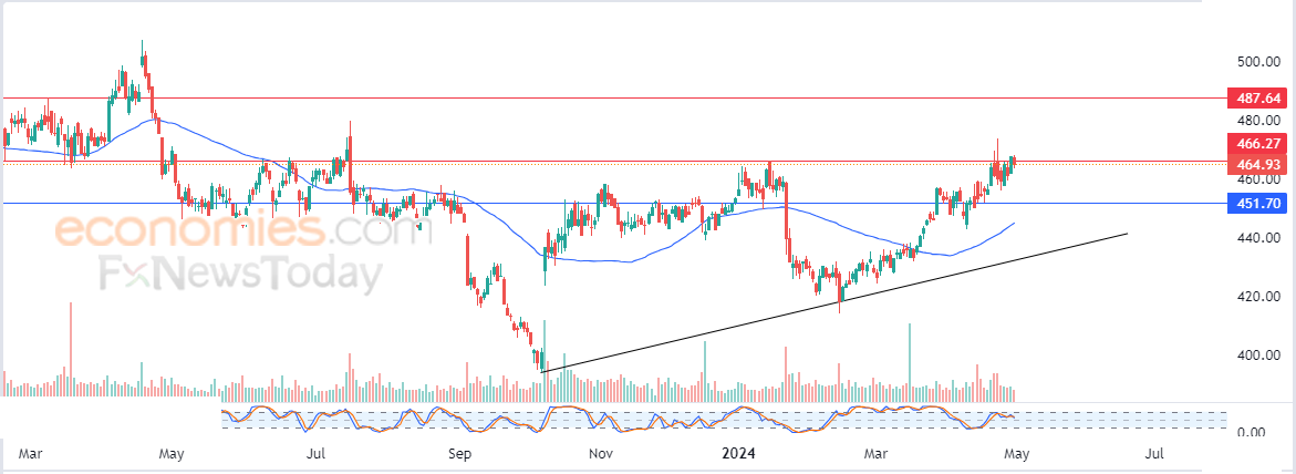 لهذا تشير توقعاتنا إلى ترجيح سيناريو عودة صعود سعر السهم خلال تداولاته القادمة، خاصة في حالة اختراقه للمقاومة سابقة الذكر 466.25$، ليستهدف بعدها مستوى المقاومة 487.65$.