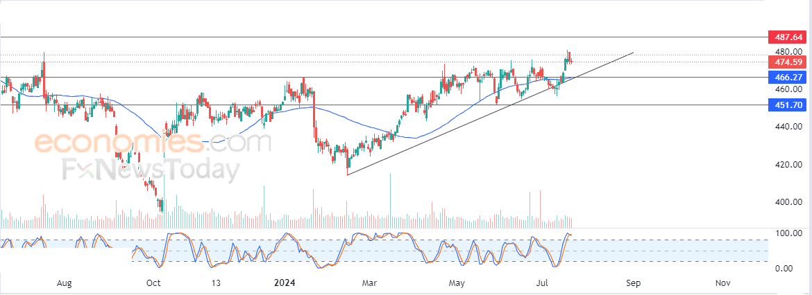 لذلك نحن نرجح عودة صعود سعر السهم خلال تداولاته القادمة، بشرط ثبات مستوى الدعم 466.30$، ليستهدف مستوى المقاومة 487.65$.