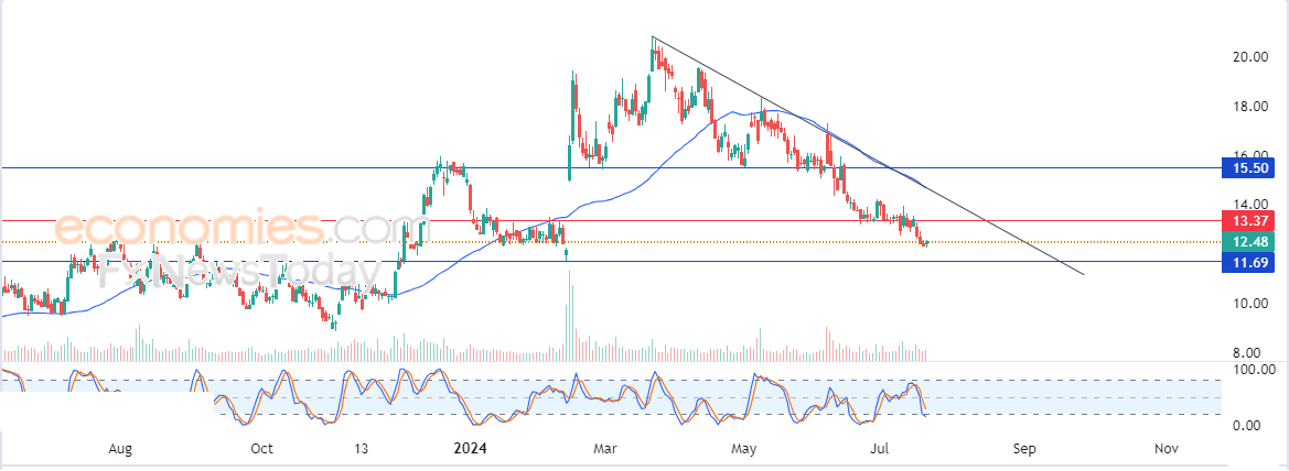 لذلك فتوقعاتنا ترجح عودة هبوط سعر السهم خلال تداولاته القادمة، طيلة استقراره دون مستوى المقاومة 13.37$، ليستهدف اولى مستويات الدعم عند سعر 11.70$.
