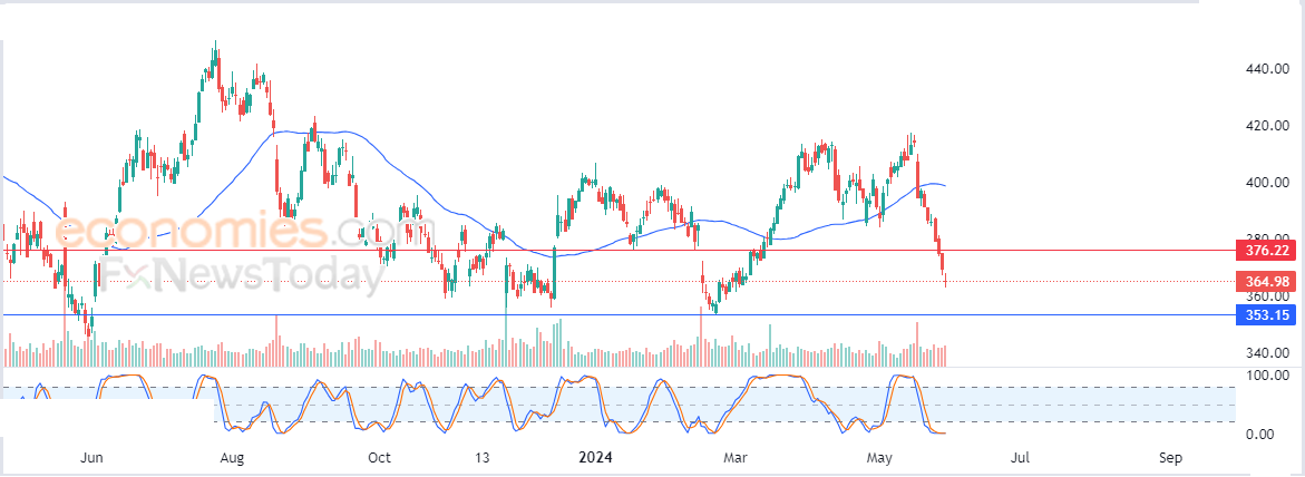 لهذا فتوقعاتنا تشير إلى استمرار هبوط سعر السهم خلال تداولاته القادمة، طيلة استقراره دون مستوى 376.22$، ليستهدف مستوى الدعم المحوري 353.15$.