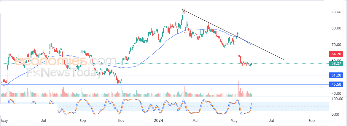لهذا فتوقعاتنا ترجح عودة هبوط سعر السهم خلال تداولاته القادمة، طيلة ثبات المقاومة 64.20$، ليستهدف أولى مستويات الدعم عند سعر 51.20$.