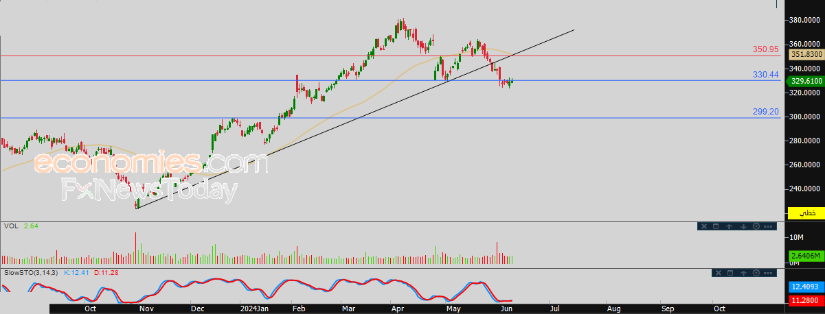 لهذا نحن نرجح عودة هبوط سعر السهم خلال تداولاته القادمة، خاصة في حالة كسره لمستوى الدعم 330.40$، ليستهدف بعدها مستوى الدعم 300.00$.