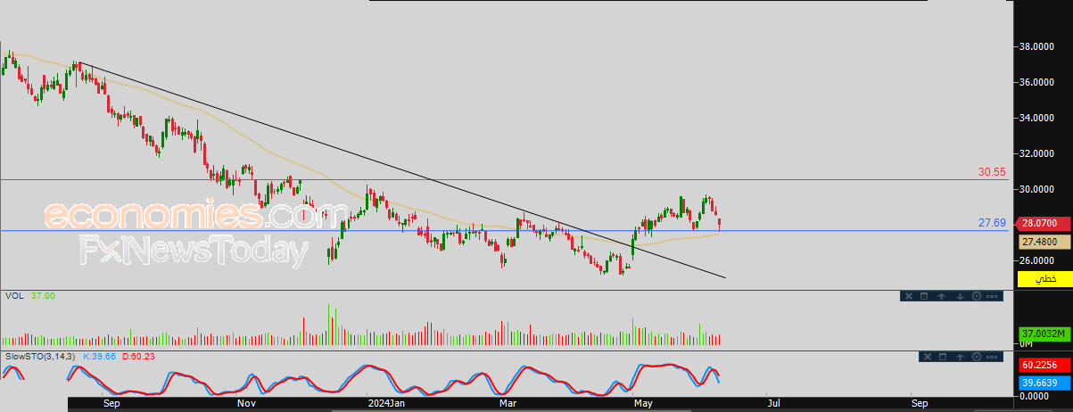 لذلك تشير توقعاتنا إلى ترجيح سيناريو عودة صعود سعر السهم خلال تداولاته القادمة، طيلة ثبات الدعم 27.70$، ليستهدف مستوى المقاومة 30.55$.